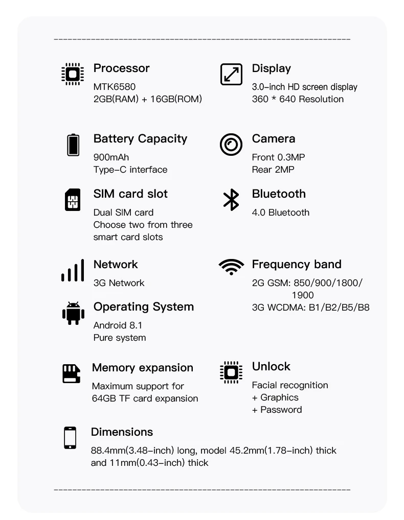 • Memory Card :2GB RAM+16GB ROM (Micro SD Maximum 128GB)
