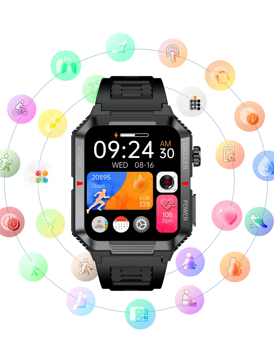 Bluetooth call function, date/day of week display, weather push, physiological cycle (APP-gender set to female to have this function), countdown timer, card management, remote photo, sedentary reminder, pedometer, distance, calories, heart rate/blood pressure/oxygen/temperature/ECG/sleep monitoring, positive thinking, bluetooth music control, incoming call reminder, text message reminder, social APP message reminder, alarm reminder Physical training, Lift up hand to light up the screen, Find phone, Stopwatch, Reject call, Do not disturb mode, Multi-dial switching, Custom dial, Brightness adjustment, Firmware upgrade and so on.